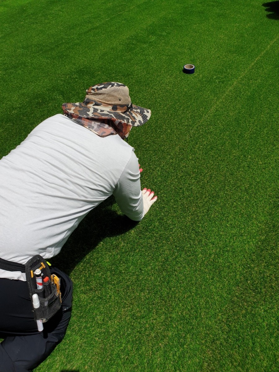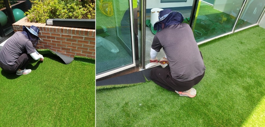 규격에 맞춰서 재단을 끝내고 나면 태풍이 불어도 잔디가 떨어지지 않도록 본드로 고정을 합니다.